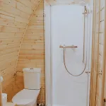 Badeværelset kan bryste sig af en bruser og håndklæder.